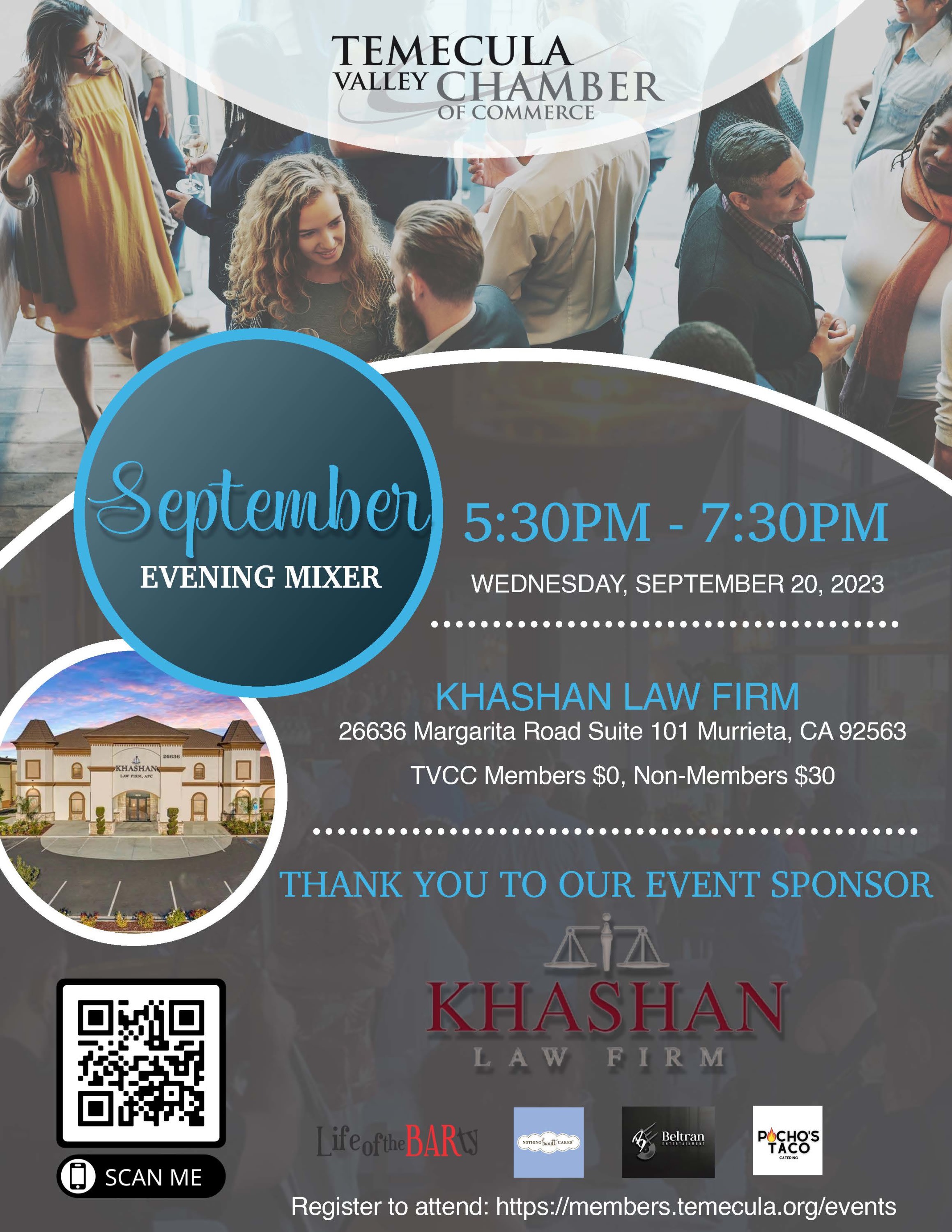 You are invited to network and unwind at the monthly Evening Mixer at Khashan Law Firm. This networking event is your time to simply enjoy the fun of getting connected to our business community while listening to music from Beltran Entertainment, enjoying tacos, and getting your face drawn by the Caricature Artist Davtoons!