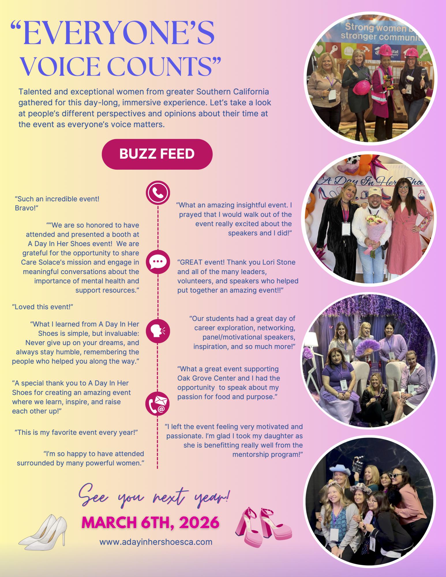 In the greater SouthernCalifornia, women’s opportunities are limitless. Inspiring, encouraging, and motivating women is what this movement is all about. For some, inspiration may mean a new career, for others it may mean exploring leadership, volunteering, or running for public office. In addition to inspiration, providing opportunities for women entering or re-entering the workforce or choosing to do something different is not easy to find, until now.