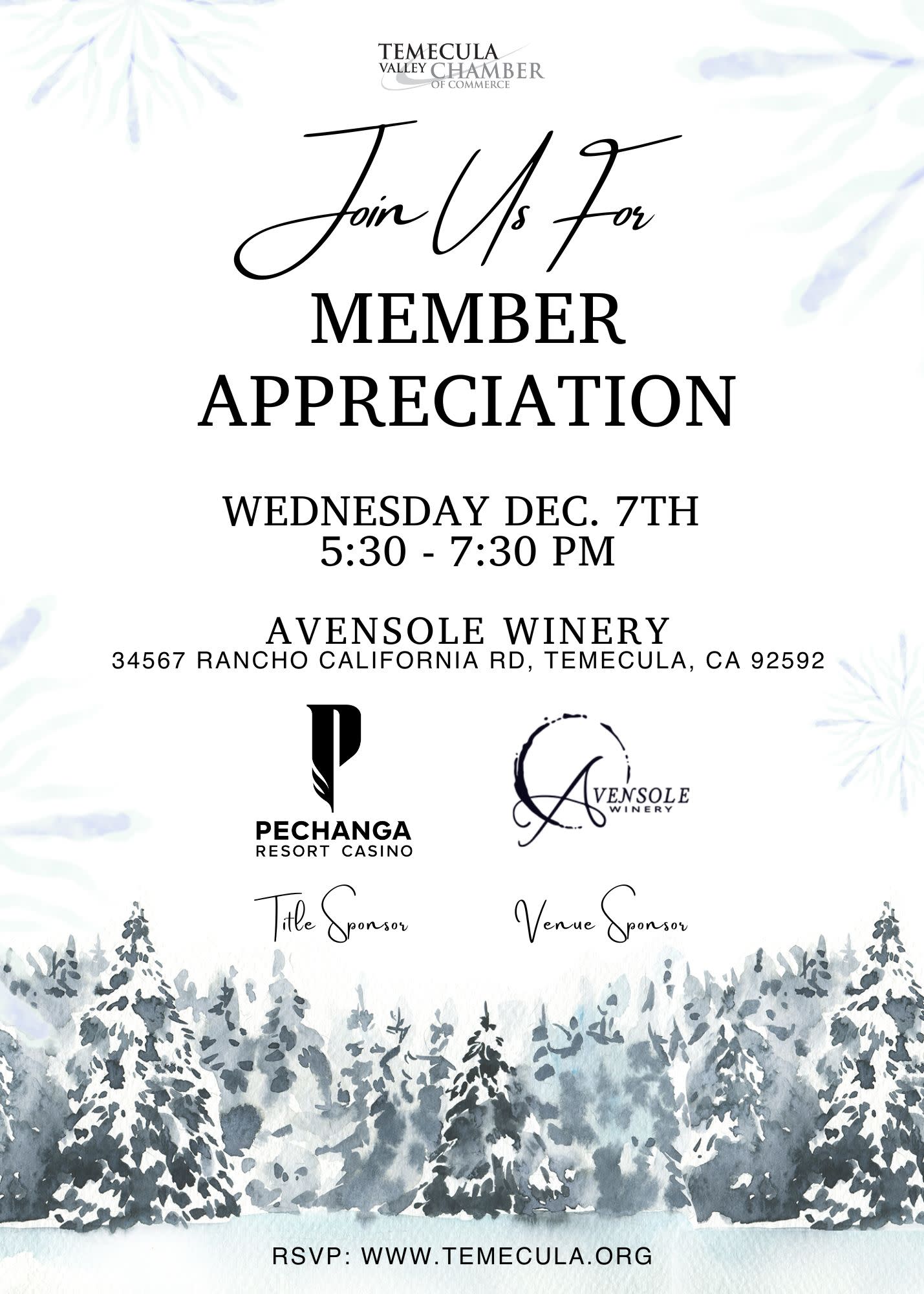The Temecula Valley Chamber of Commerce Board of Directors and Staff invite you to join us in celebrating our valued members at the Annual Member Appreciation Night. This year, the event will be held at the beautiful Avensole Winery located in Temecula Wine Country! Guests will enjoy an evening of networking and celebration while enjoying hors d'oeuvres, desserts, and a no-host bar. The Chamber will recognize and honor milestone members with special certificates and plaques for their long-standing partnership. This event is for TVCC Members, only. Register to attend as space is limited.