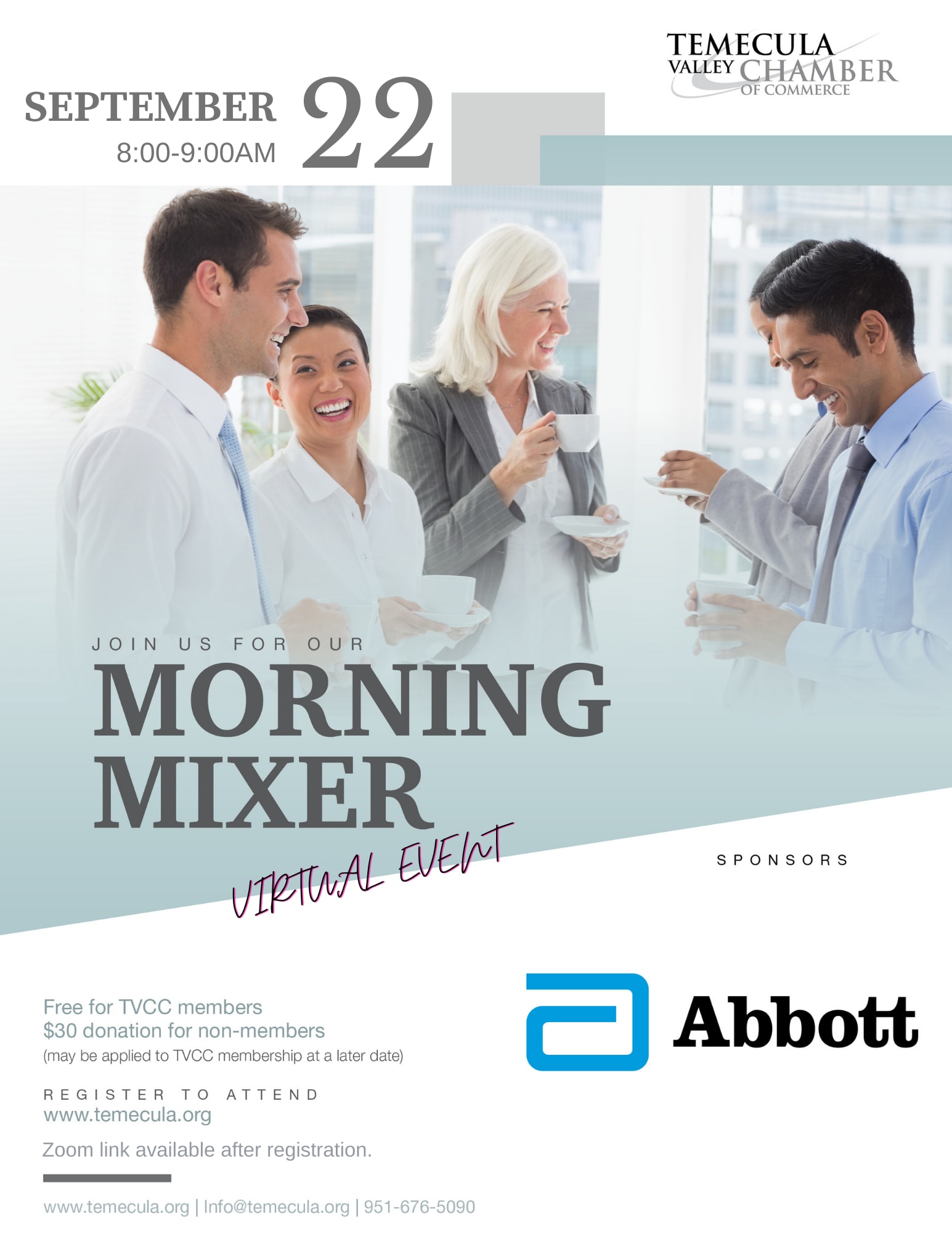 Let's mix it up, Zoom-style! You're invited to the (virtual) Morning Mixer on Zoom. Bring your cup of coffee (or tea) and log in on your computer to network from home. Registration is required to attend. No charge for TVCC Members and $30 for guests. We look forward to seeing you (virtually)!