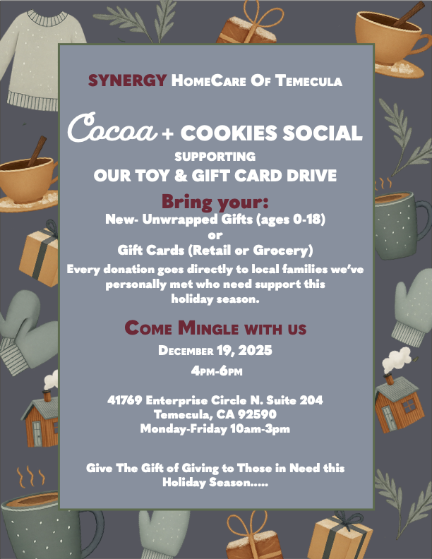 Join SYNERGY HomeCare of Temecula for a festive Cocoa & Cookies Social on Friday, December 19, 2025, from 4:00–6:00 PM! Enjoy warm cocoa, delicious cookies, and friendly holiday mingling as we celebrate the season together.