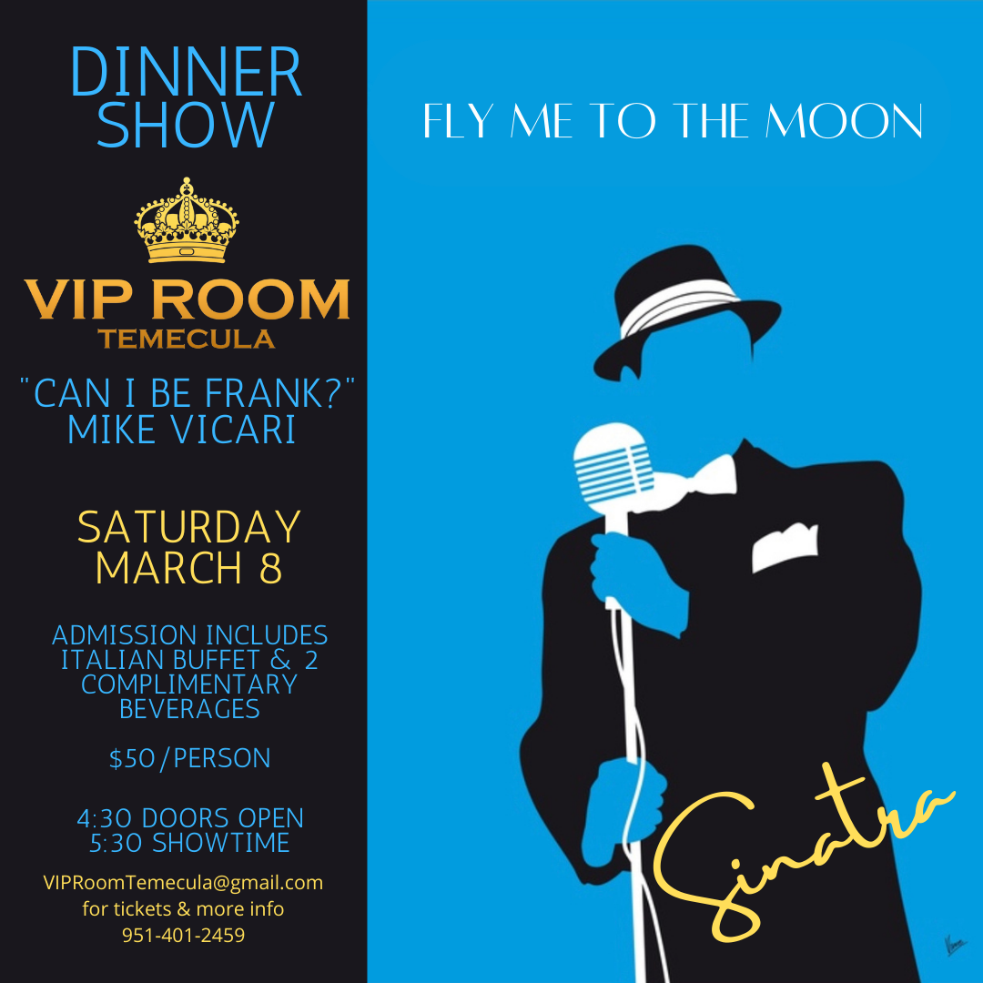 DESCRIPTION:Come join us for a night of classic hits and delicious food at the VIP Room. Get ready to be serenaded by the smooth sounds of Ol' Blue Eyes himself in this intimate setting. This in-person event promises to transport you back to the golden age of music. Indulge in a delectable meal while enjoying timeless hits like "Fly Me to the Moon" and "My Way". Grab your friends and family for a memorable evening filled with nostalgia and entertainment. Don't miss out on this unique experience!For tickets and more info\, reach us at (951)401-2459 or VIPRoomTemecula@gmail.com