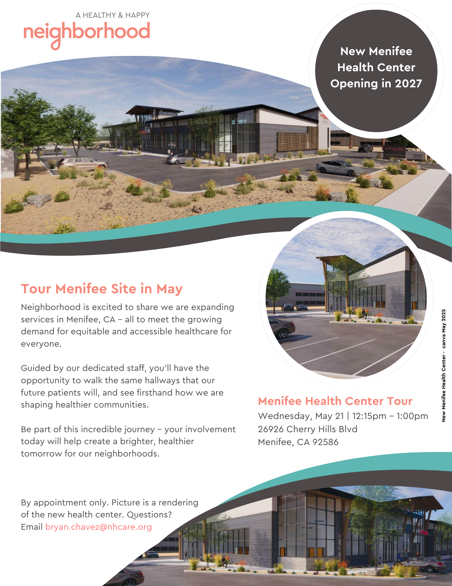 DESCRIPTION:We warmly invite you to join us for a guided tour of one of our twenty-nine health centers\, the Menifee Health Center in Riverside County. Accompanied by our dedicated staff\, we will explore the hallways that many of our patients walk every day.\nCome be a part of our future where your support helps build a healthier tomorrow.\nWednesday\, May 21st\, 2025 | 12:15 pm - 1:00 pmNeighborhood Healthcare - Menifee | 26926 Cherry Hills Blvd\, Menifee\, CA 92586\nForm closes 2 business days before the tour date.\nRSVP Today: https://forms.office.com/r/WGwKLsiwdE